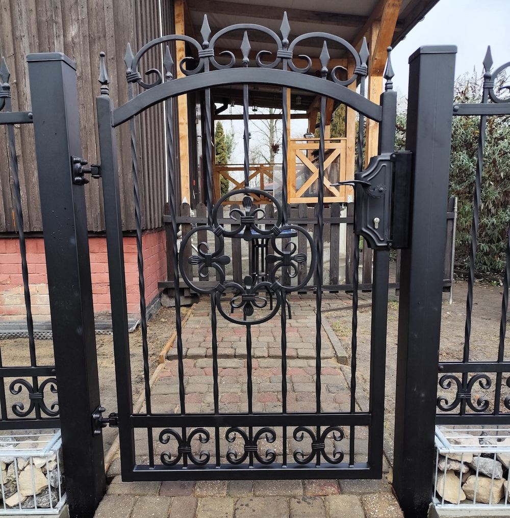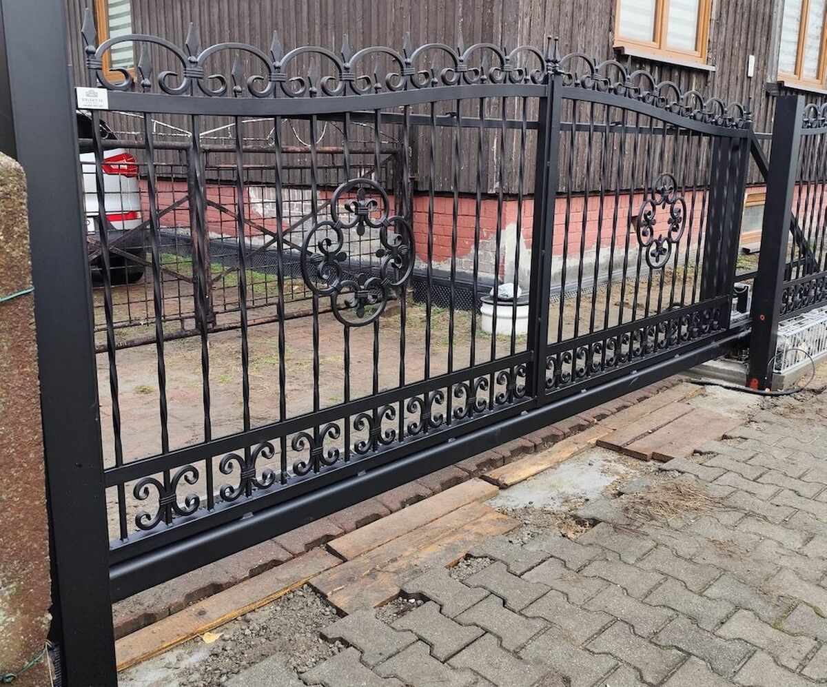 Brama wjazdowa przesuwna ogrodzeniowa kuta czarna z ornamentami BP 028