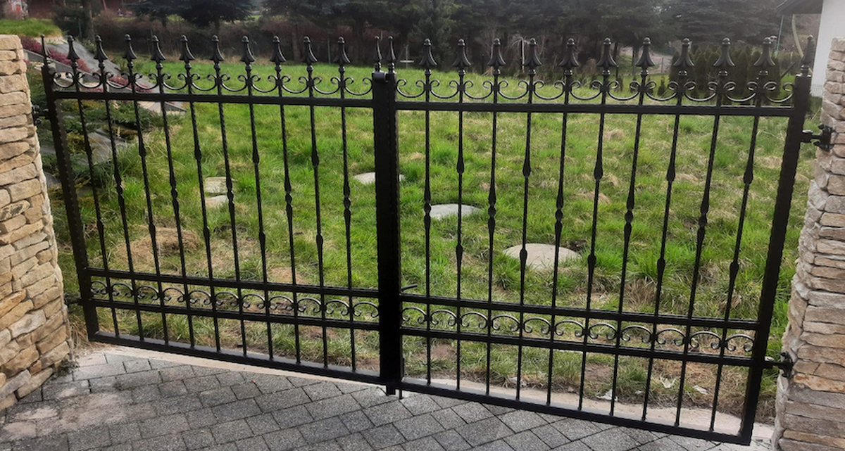 Brama ogrodzeniowa wjazdowa, uchylna, kuta ze zdobieniem BU 095