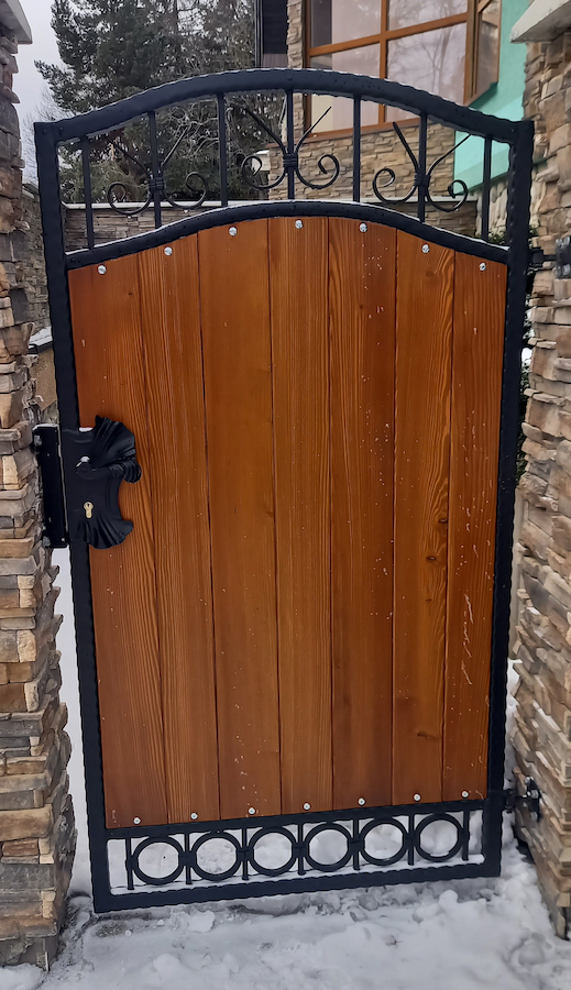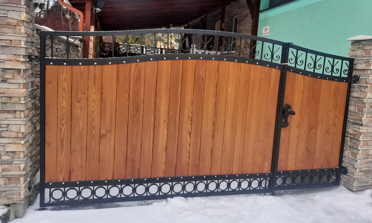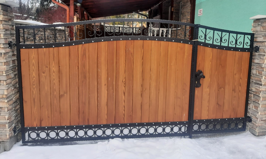 Brama wjazdowa, dwuskrzydłowa, uchylna, kuta z drewnem BU 104