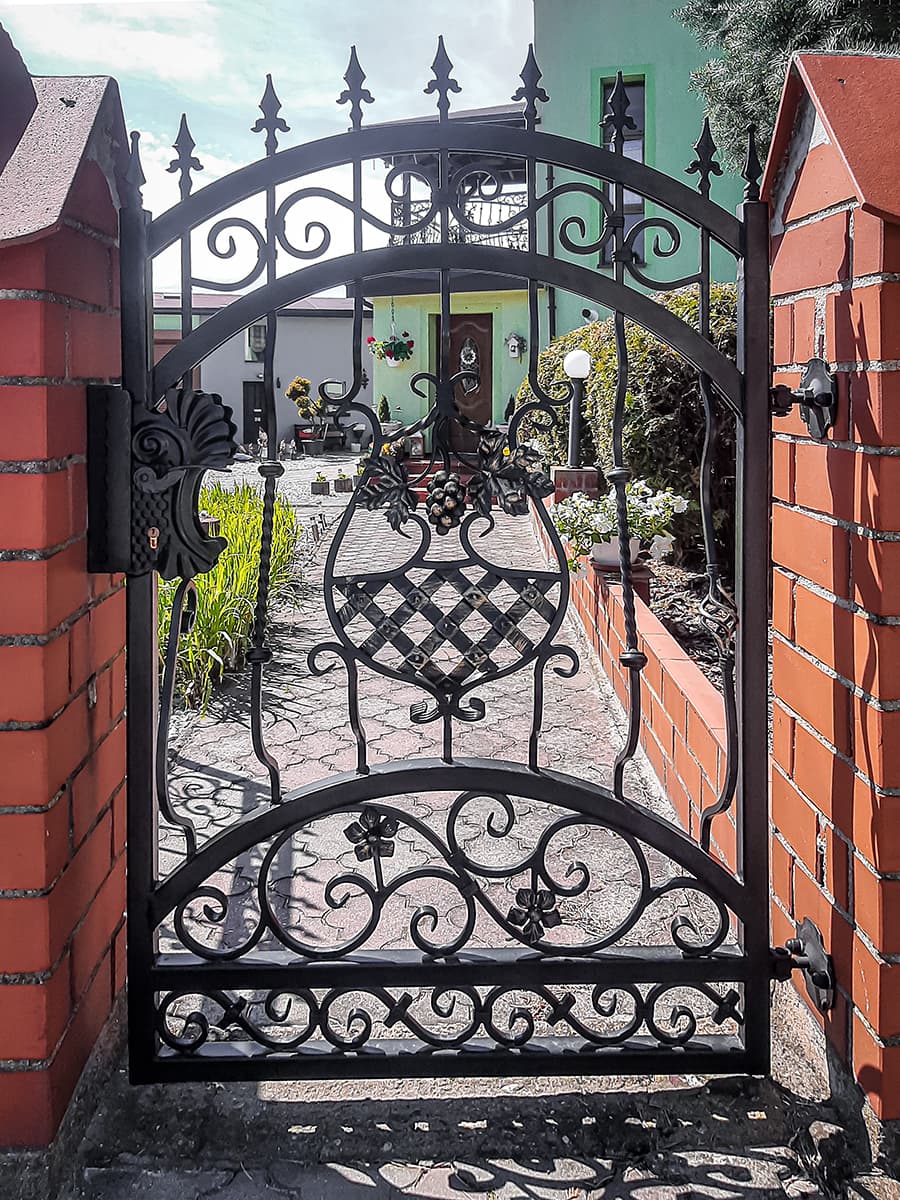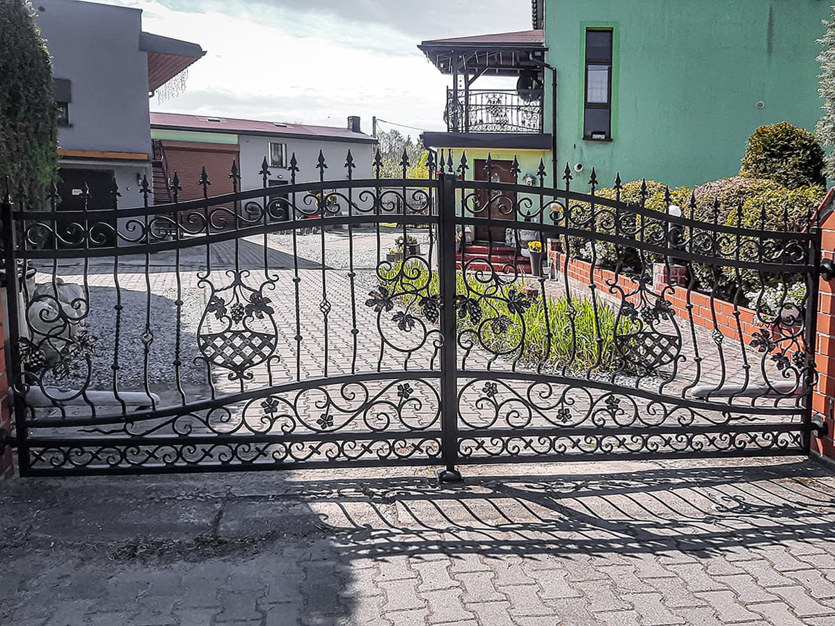 Brama ogrodzeniowa wjazdowa, uchylna, kuta ze zdobieniem BU 095