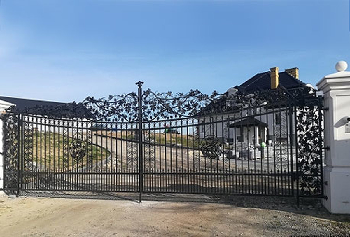 Brama ogrodzeniowa, wjazdowa, uchylna, kuta we wzorki BU 092