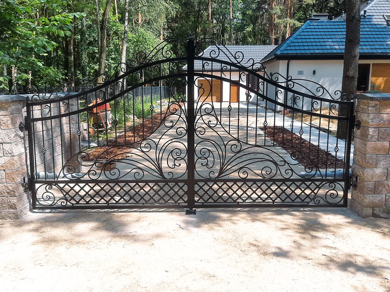 Brama wjazdowa, dwuskrzydłowa, uchylna, kuta z drewnem BU 104