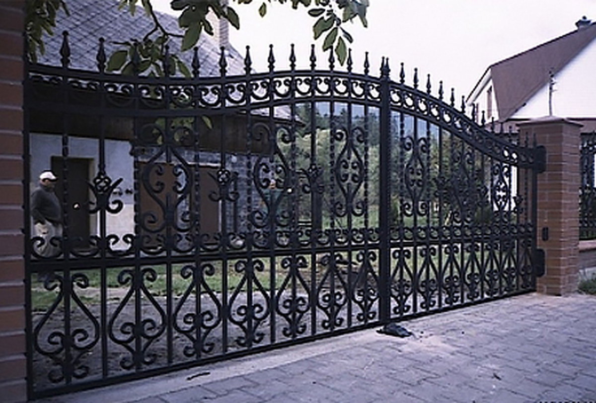 Brama wjazdowa, dwuskrzydłowa, uchylna, kuta z drewnem BU 104