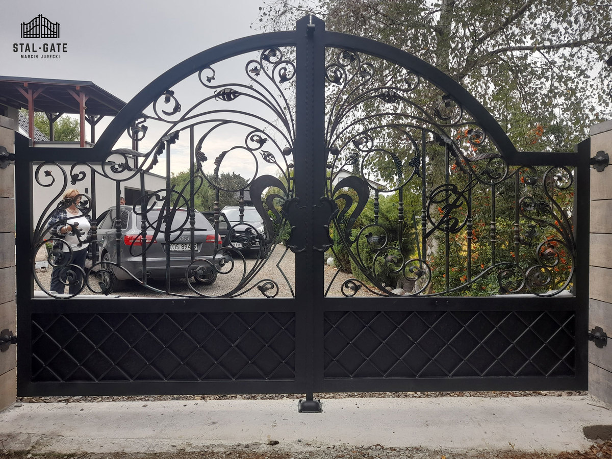 Brama ogrodzeniowa wjazdowa, uchylna, kuta ze zdobieniem BU 095