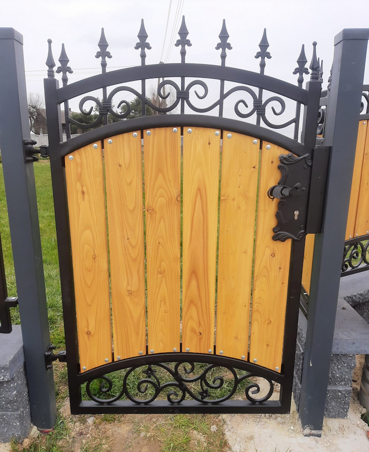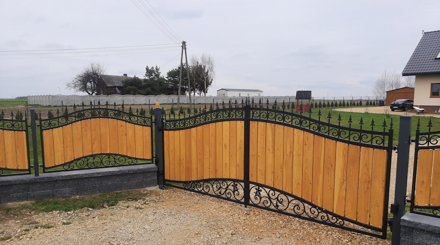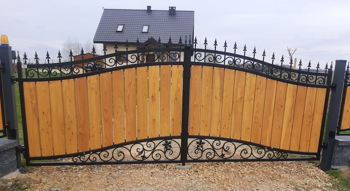 Brama wjazdowa z drewnem, uchylna, kuta BU 107