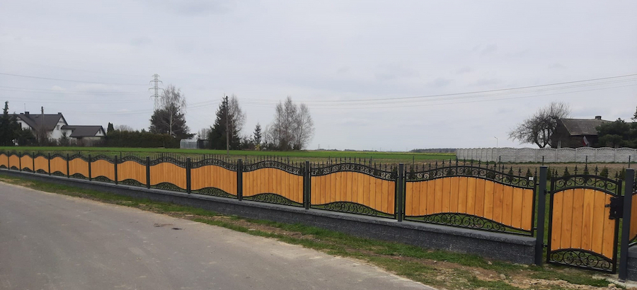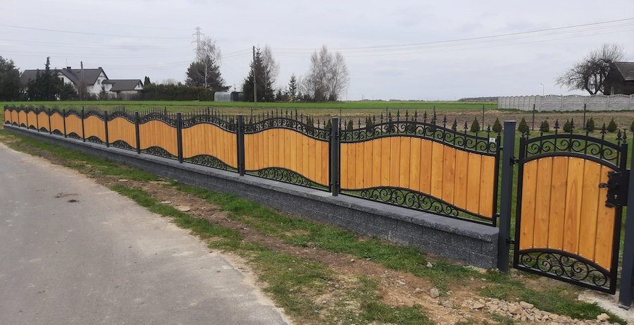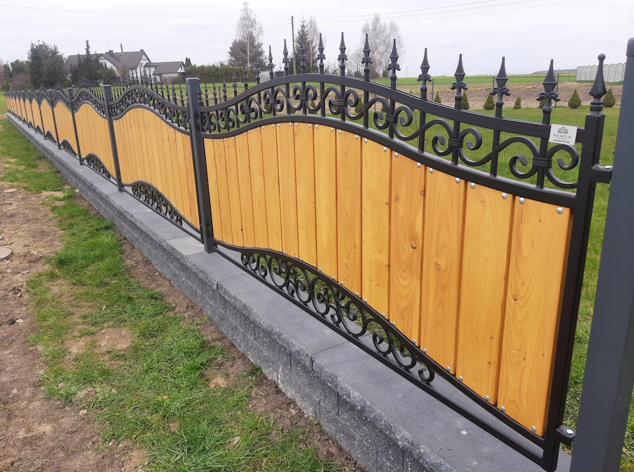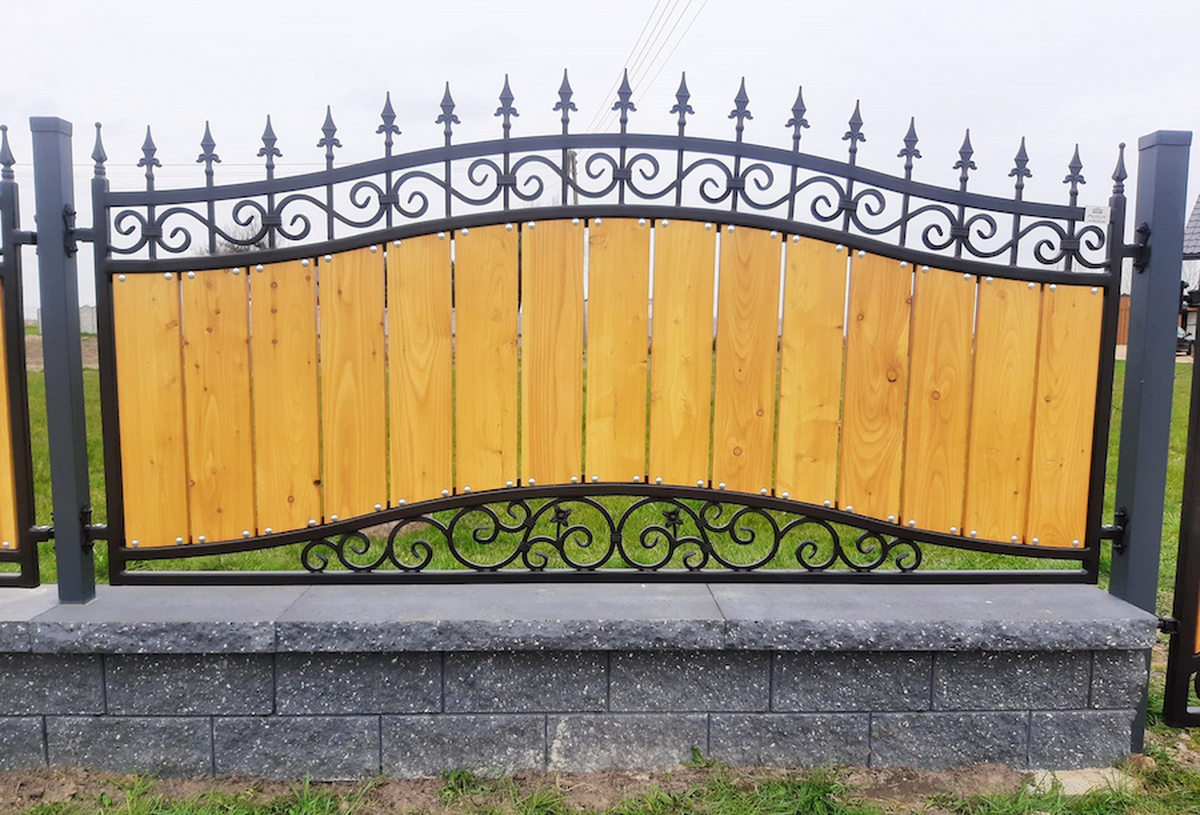 Ogrodzenie kute zdobione z drewnem OK 055